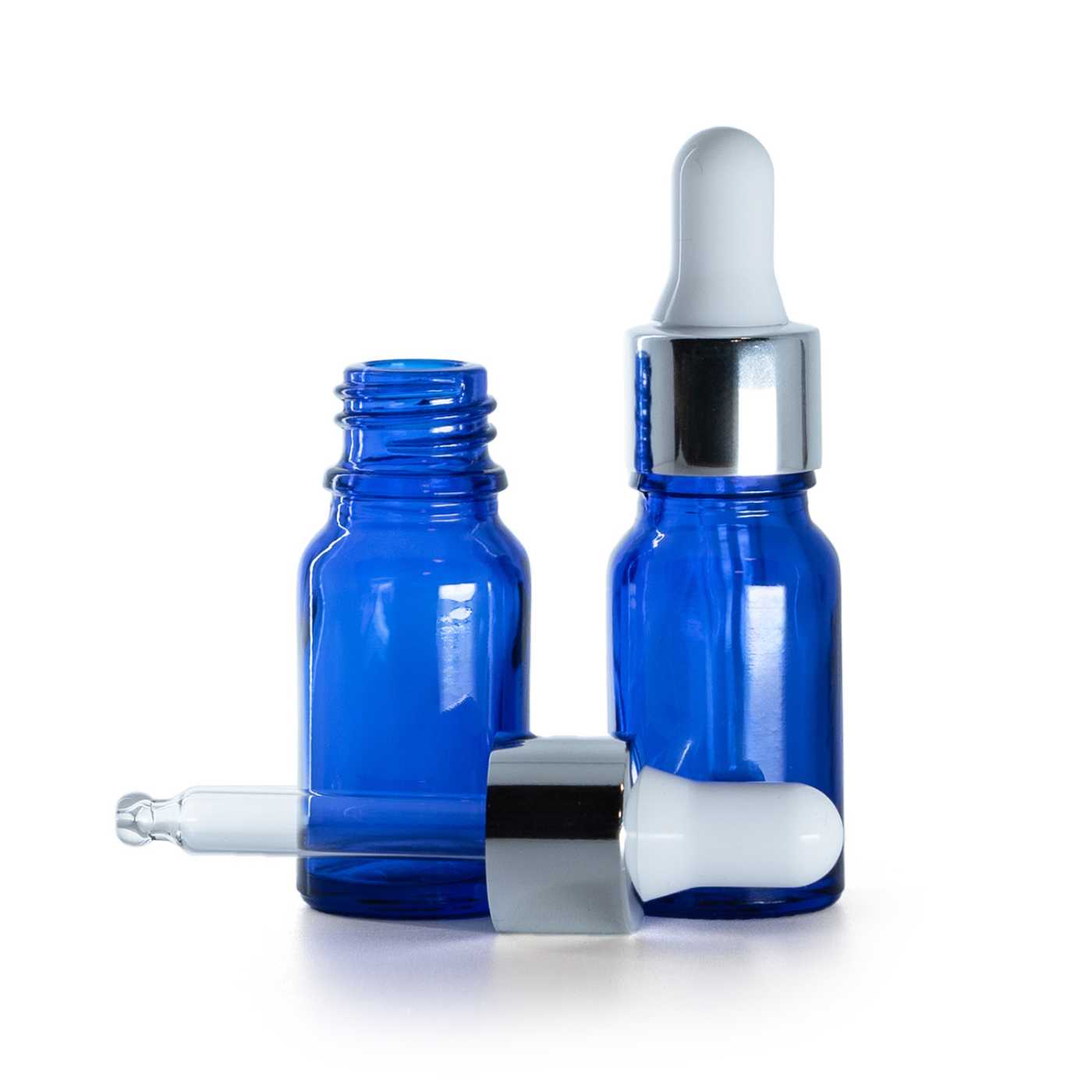 Kék üvegpalack fényes ezüst pipettával 10 ml