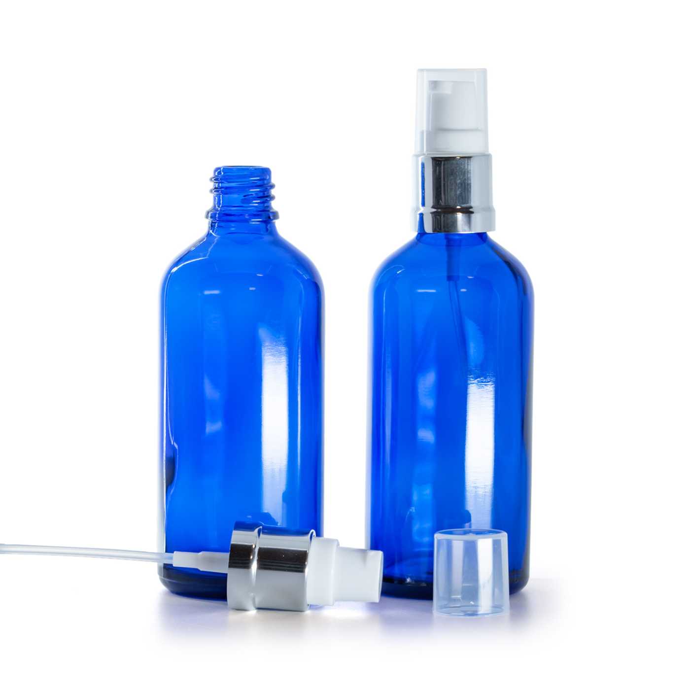 Kék üvegpalack, fényes fehér-ezüst adagoló, 100 ml