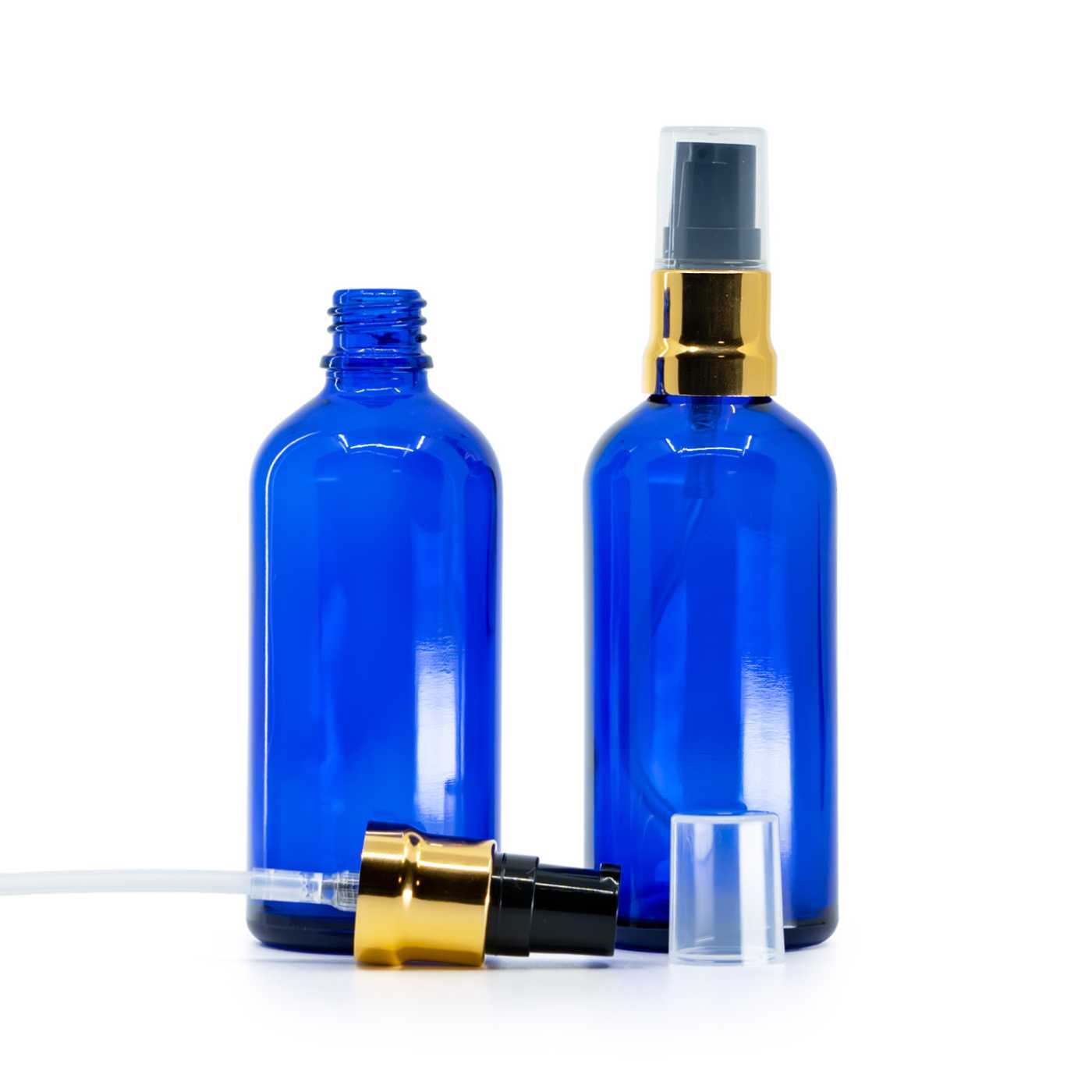 Kék üvegpalack, fényes fekete aranyszegélyes adagoló átlátszó kupakkal, 100 ml