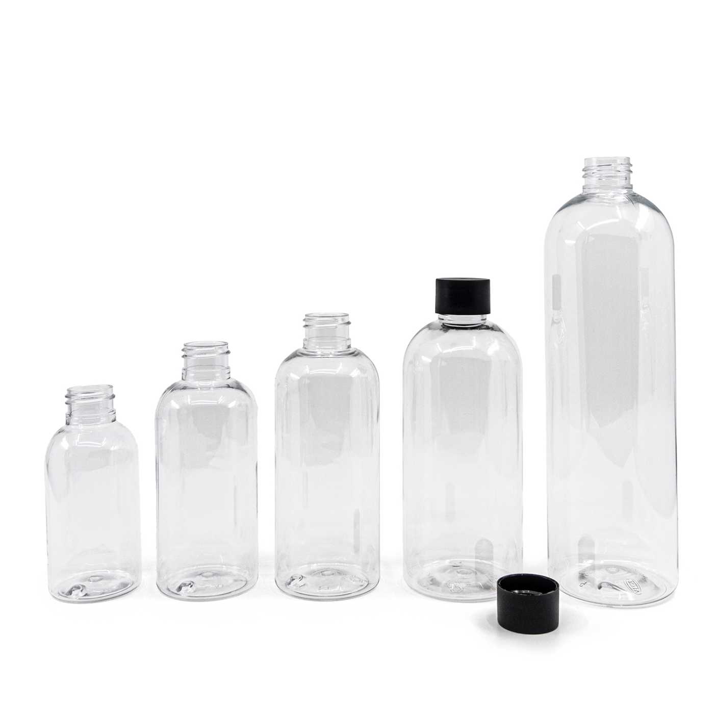 Kerek, átlátszó műanyag palack, 24/410, matt fekete kupak, 300 ml
