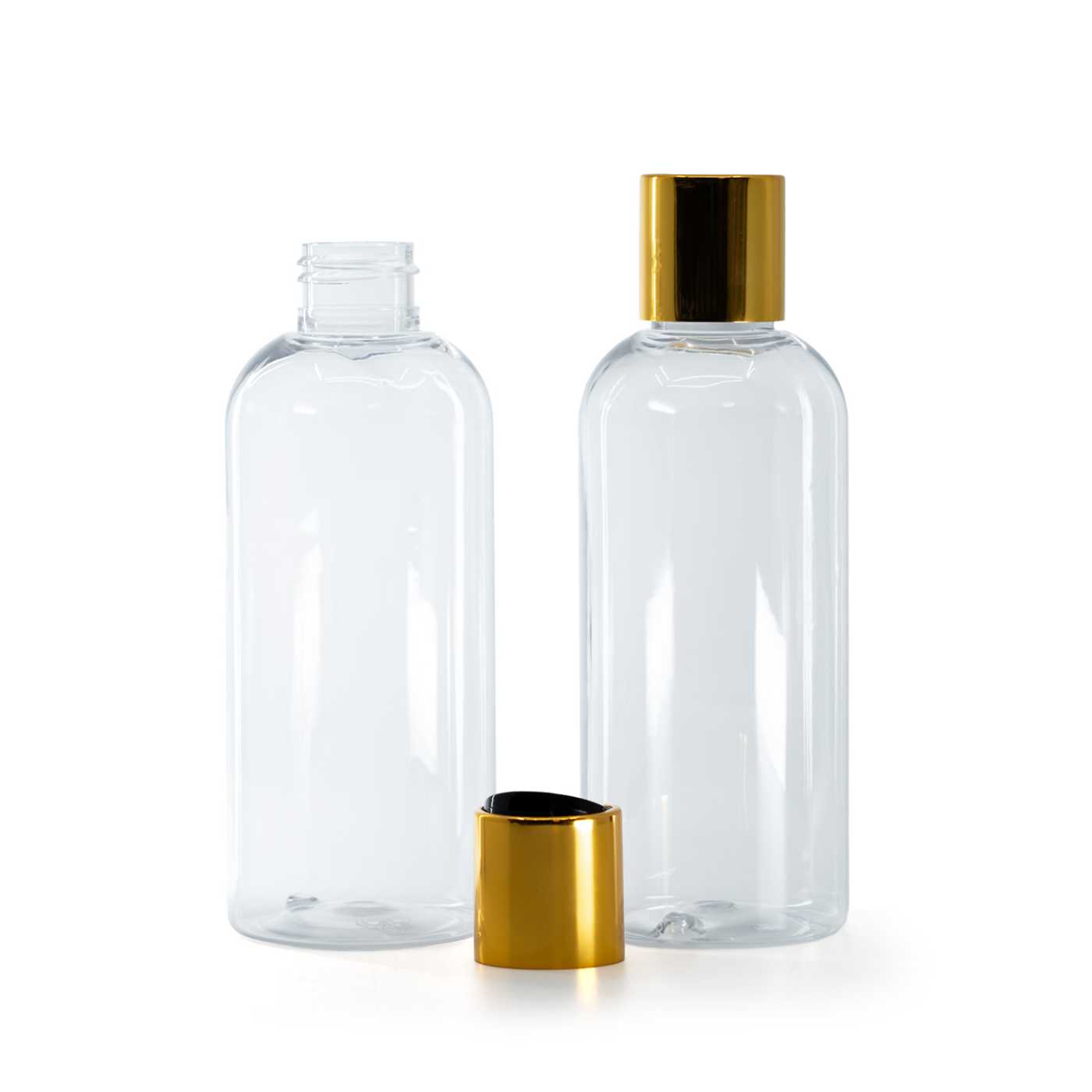 Kerek, átlátszó műanyag palack, arany disc top kupakkal fekete betéttel, 200 ml