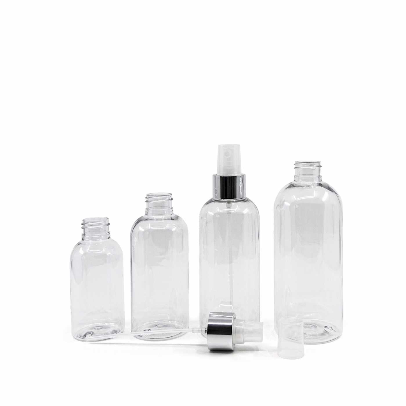 Kerek, átlátszó műanyag palack, átlátszó szórófej fényes ezüst gyűrűvel, 300 ml