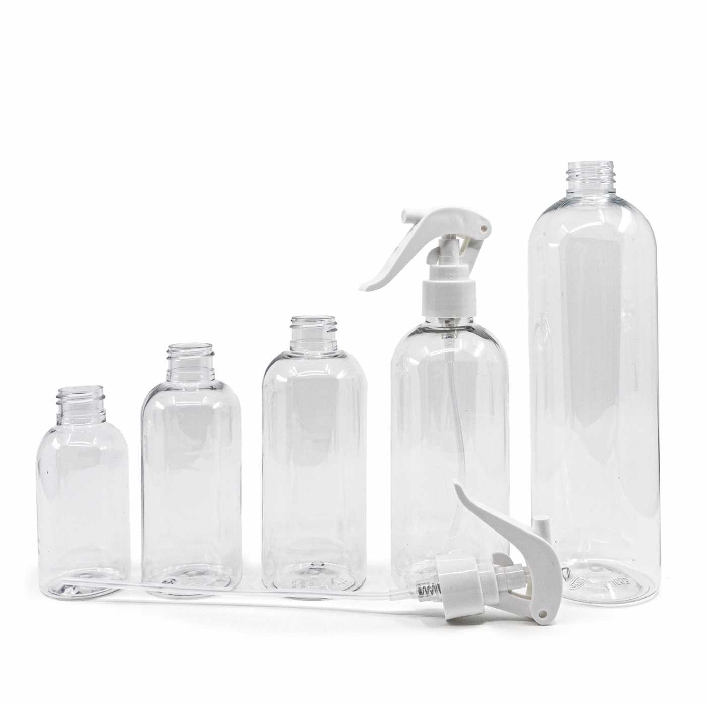 Kerek, átlátszó műanyag palack, fehér permetezőpisztoly, 500 ml