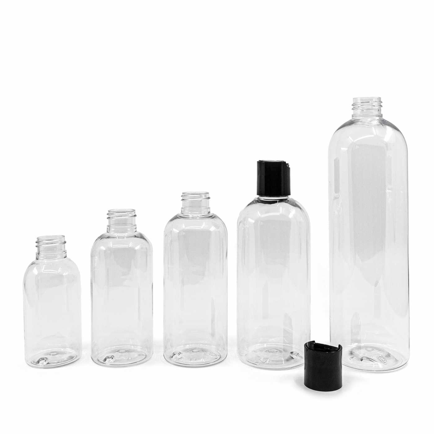 Kerek, átlátszó műanyag palack, fekete disc top kupakkal, 100 ml