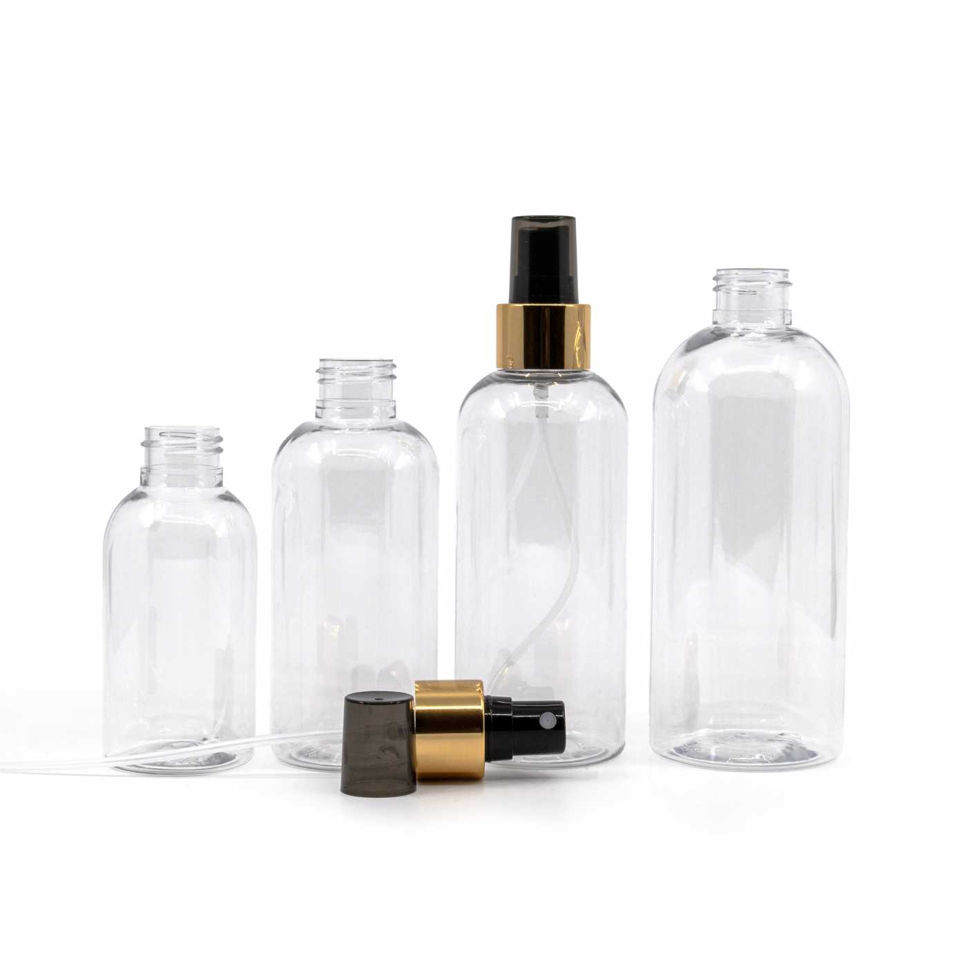 Kerek, átlátszó műanyag palack, fekete permetezővel, fényes arany gallérral, 300 ml