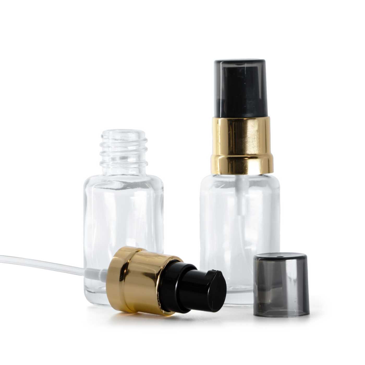Kerek, átlátszó üvegpalack fényes fekete-arany adagolófejjel, 12 ml