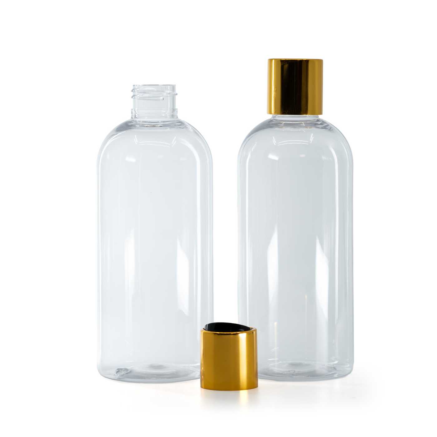 Kerek, áttetsző műanyag palack, disc-top kupakkal, arany gallérral, fekete betéttel, 300 ml