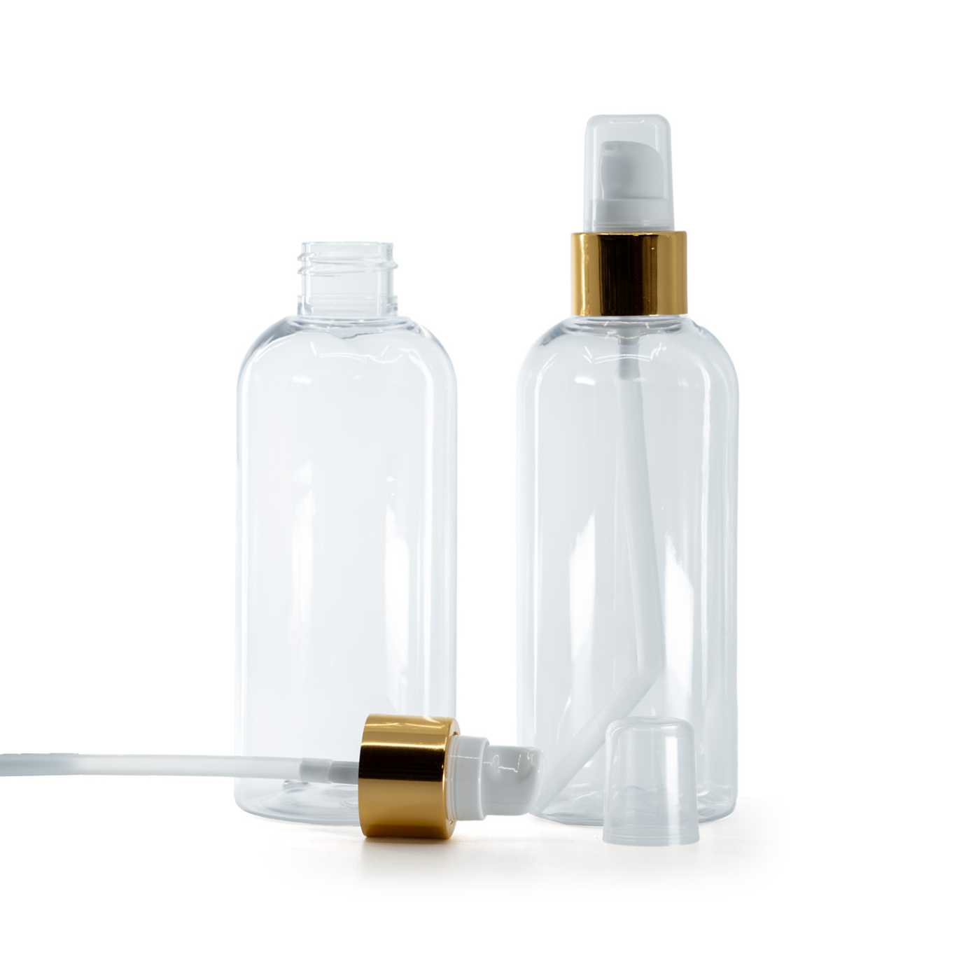 Kerek, áttetsző műanyag palack, fehér-arany adagolópumpa kupakkal, 200 ml