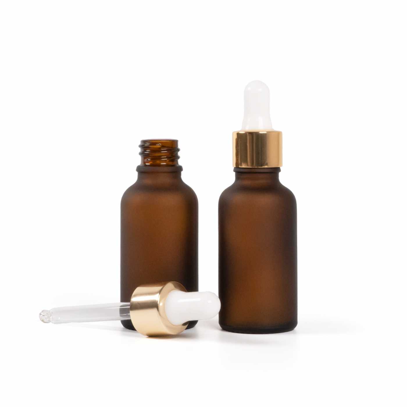 Matt borostyánszínű üvegpalack fehér-arany pipettás kupakkal 30 ml