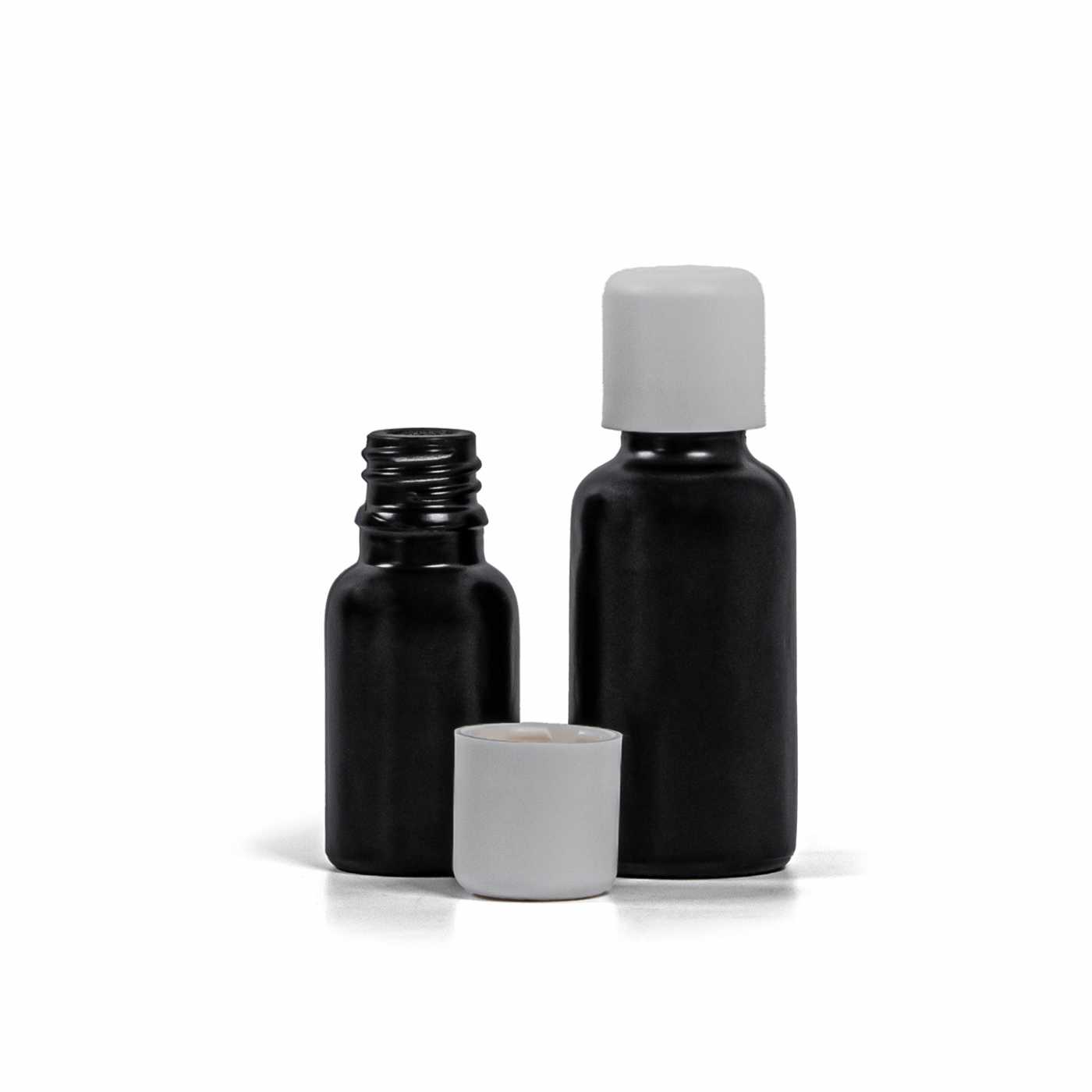 Matt fekete üvegpalack, fehér biztonsági kupak pipettával, 15 ml