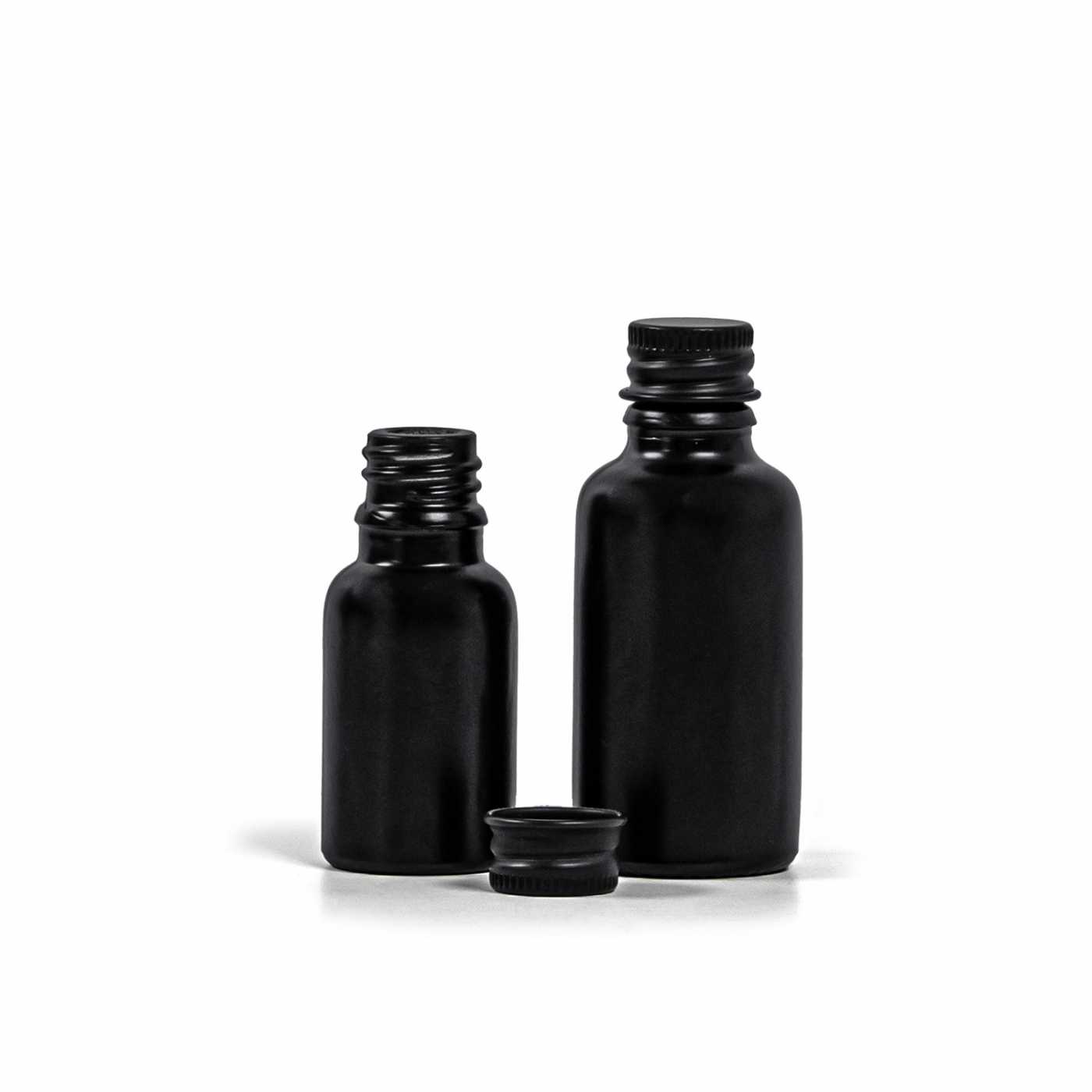 Matt fekete üvegpalack fekete alumínium kupakkal, 15 ml