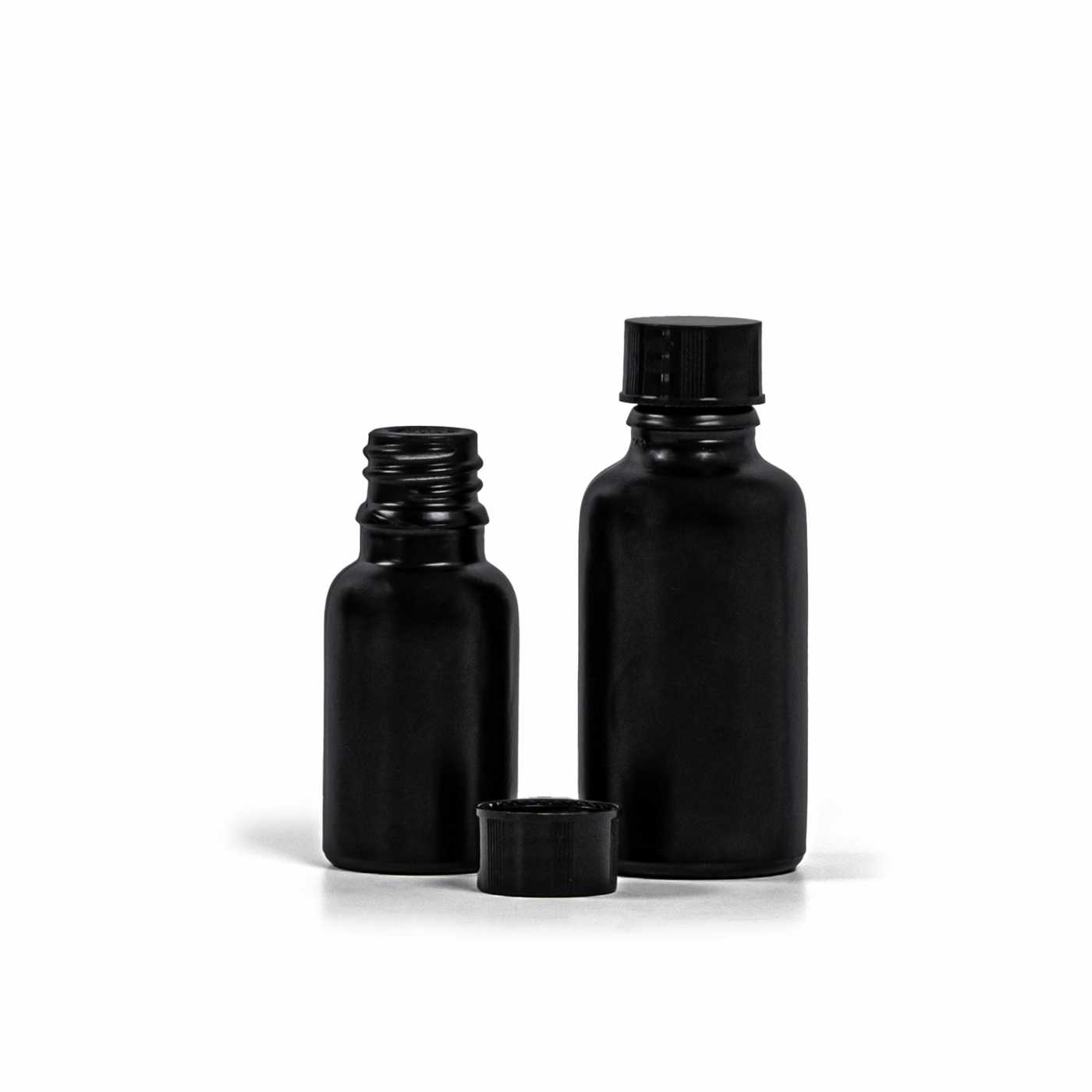 Matt fekete üvegpalack, fekete kupak, 15 ml