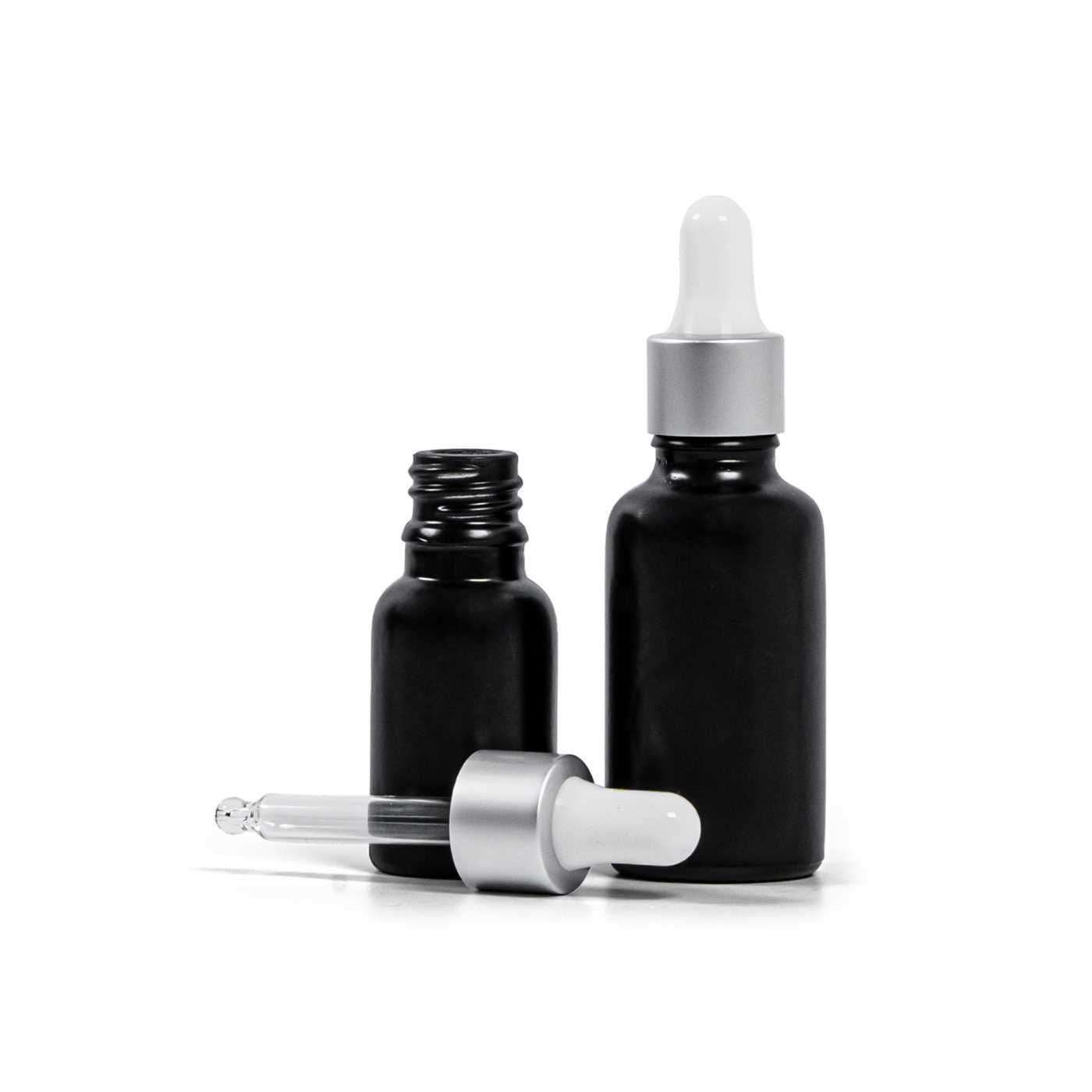 Matt fekete üvegpalack, matt ezüst cseppentős kupak, 15 ml