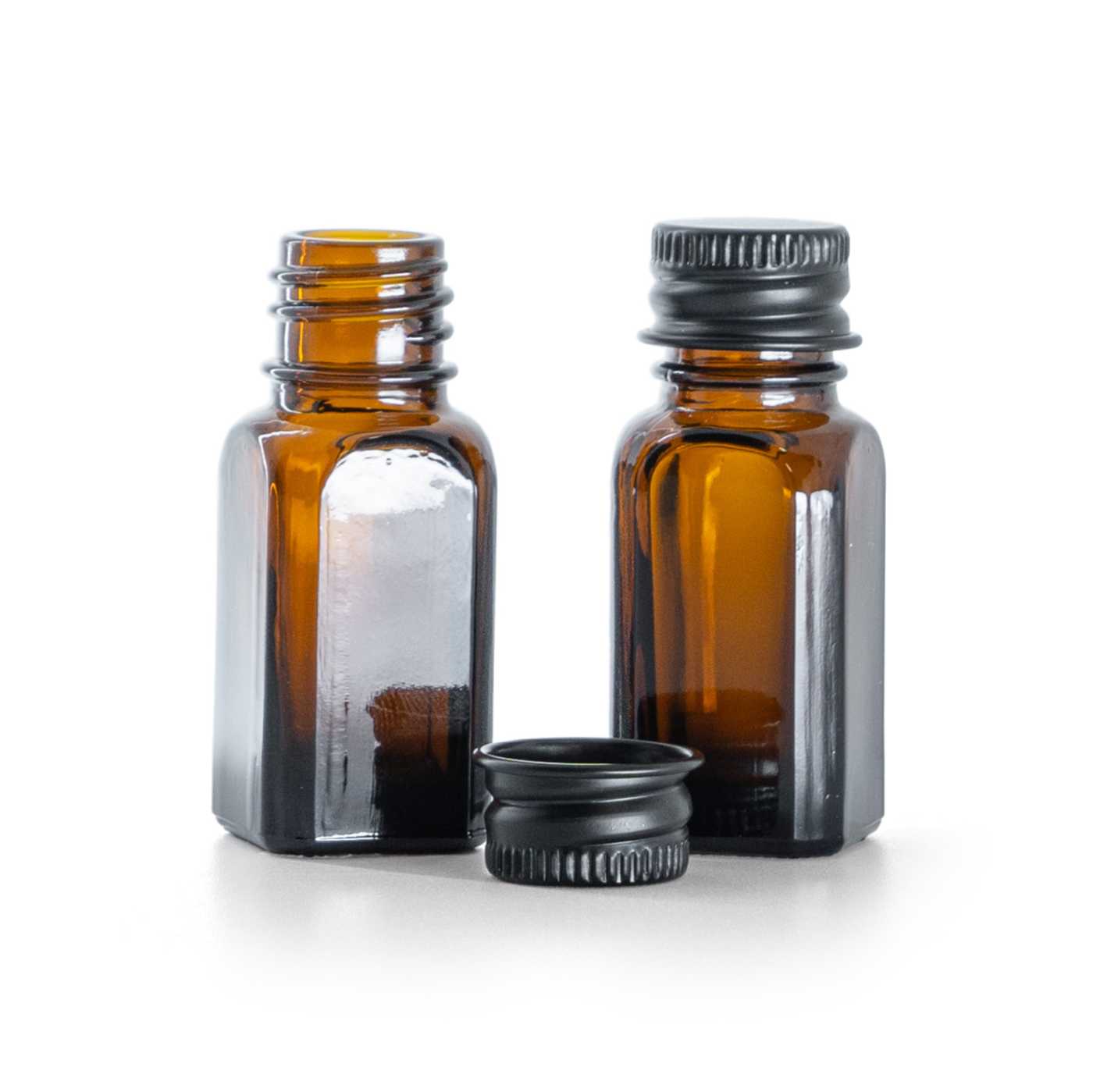 Szögletes átlátszó üvegpalack fekete alumínium kupakkal, 10 ml