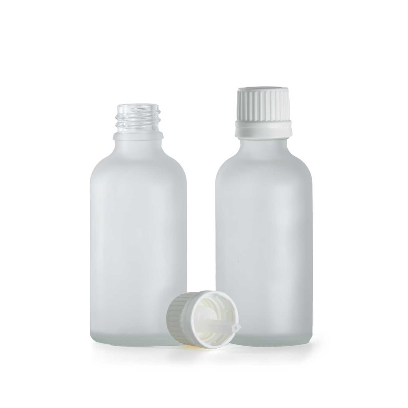 Tejszerűen átlátszó üvegpalack, fehér garanciazáras kupak cseppentővel, 50 ml