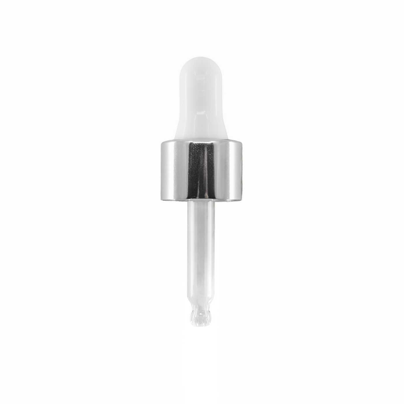 Üveg cseppentő, fehér/ezüst fényű kombináció, 18 mm nyakátmérőjű és 5 ml térfogatú üveghez.