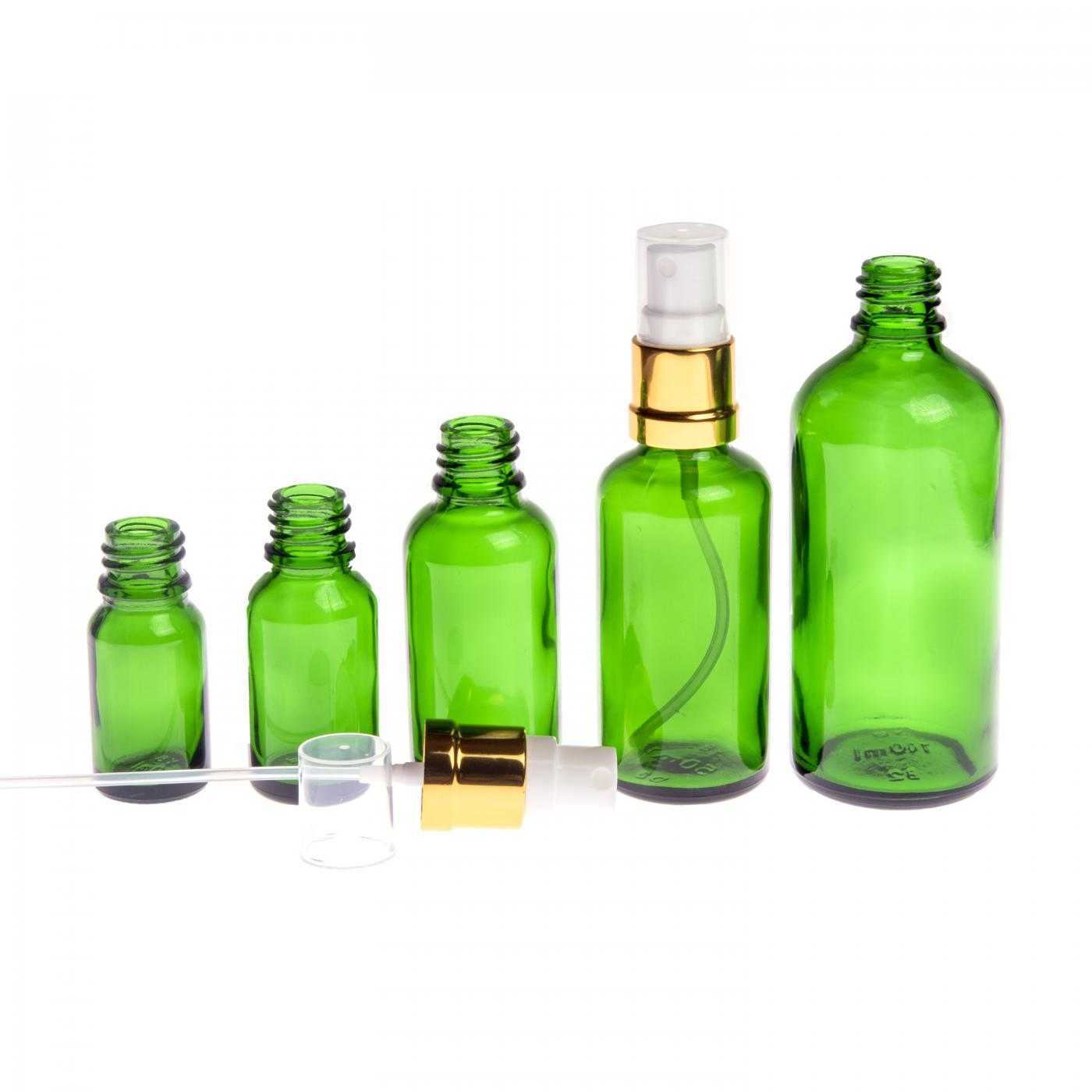 Zöld üvegpalack, fehér és fényes arany permetezőfej, 100 ml