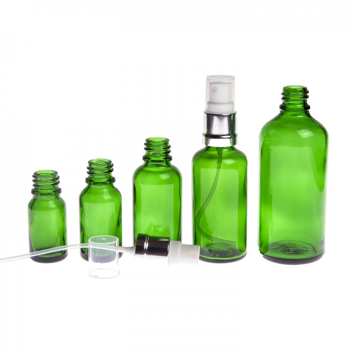 Zöld üvegpalack fehér-ezüst permetezőfejjel, 30 ml