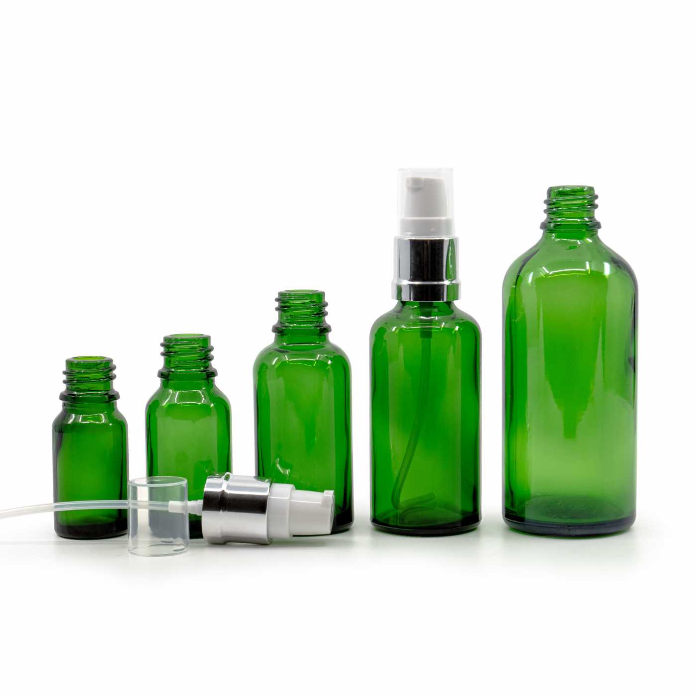 Zöld üvegpalack, fényes fehér-ezüst adagoló, 10 ml